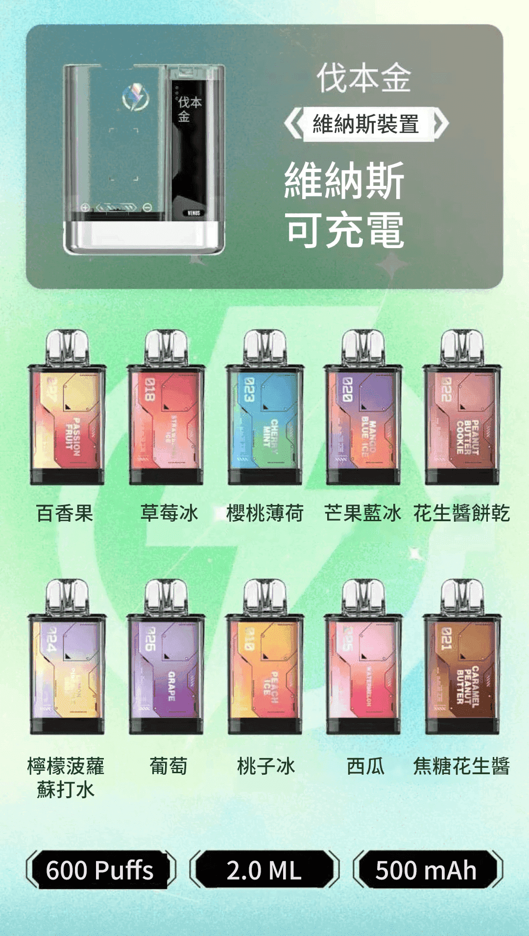 | 主機(半透明)/口味(一盒2入) | 單主機(半透明), 百香果, 草莓冰, 櫻桃薄荷, 芒果藍冰, 花生醬餅乾, 檸檬菠蘿蘇打水, 葡萄, 桃子冰, 西瓜, 焦糖花生醬 |